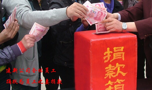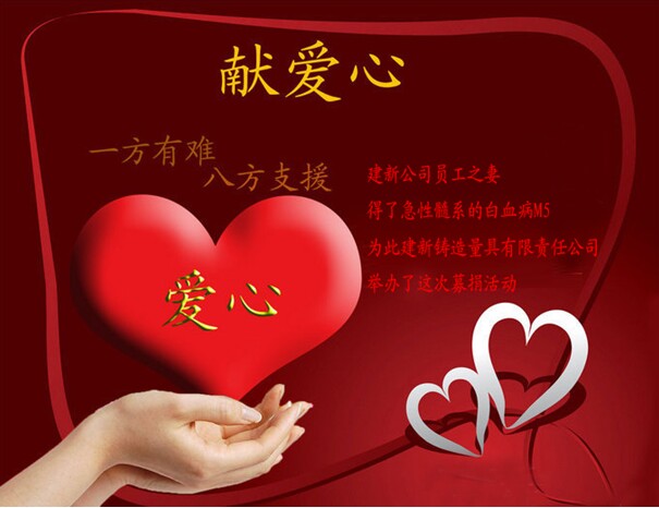 “一方有難,八方支援”。當得知本公司員工之妻的病情已經做了四個療程的化療,并且需要做移植手術,急需巨額醫療費用這個消息時。由我建新公司劉總發出倡議,一場聲勢浩大的愛心捐款行動在公司迅速展開起來,公司全體員工熱烈響應。